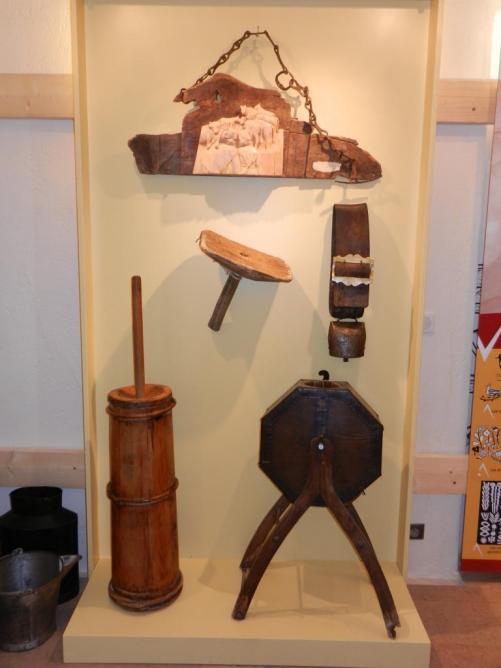 Après avoir évoqué la culture de la vigne, la fenaison ou bien encore le travail du bois, une nouvelle salle nous conduit dans l'alpage. La vitrine principale a pour visuel le festin des tarines. C'est avec le lait de ces vaches, ainsi que celui des vaches de la race Abondance, que va être produit le beaufort.