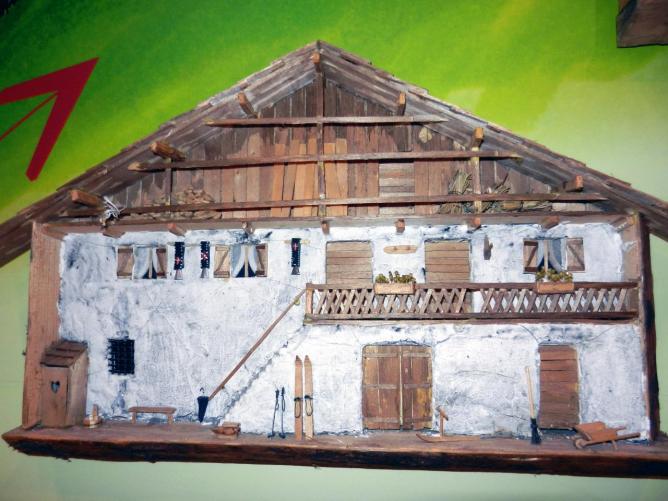 La maquette au premier plan représente la maison d’alpage (« l’arbé ») d’une famille de Saint Martin de Belleville. Dans cette commune où il n’y avait pas d’alpage communautaire, les femmes et les enfants y passaient l’été avec tous les animaux ; les hommes restant au village pour faire les foins et moissonner.